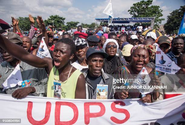 UDPS opposition party supporters shout slogans and wave banners as they take part in a rally in Kinshasa on April 24, 2018, the first opposition rally authorized since September 2016. - DR Congo's opposition held an authorised mass rally for the first time in nearly two years to mark the 28th anniversary of multi-party politics in the country, as tensions grow over veteran President Joseph Kabila's refusal to quit despite the expiry of his mandate. (Photo by Junior D. KANNAH / AFP) (Photo credit should read JUNIOR D. KANNAH/AFP via Getty Images)