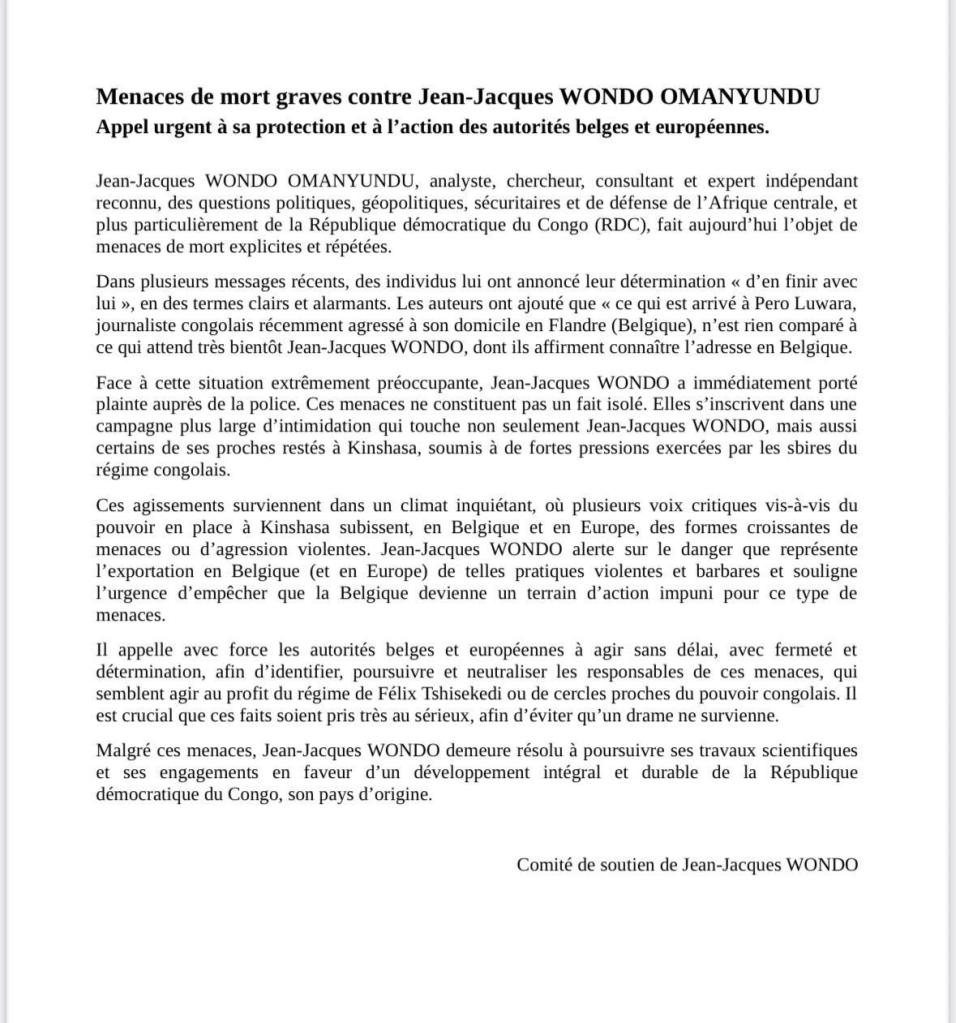 Dans plusieurs messages récents, des individus ont clairement exprimé leur détermination à « en finir avec lui », en des termes alarmants. Les auteurs de ces menaces ont ajouté que ce qui est arrivé au journaliste congolais Pero Luwara, récemment agressé à son domicile en Flandre belge, « n’est rien » comparé à ce qui attend Jean-Jacques Wondo Omanyundu. Ils affirment même connaître son adresse en Belgique.